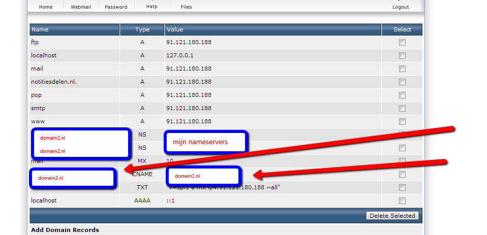 De A reccord staat ook verwezen naar de ip van de hoofdwinkel dus domein1.nl