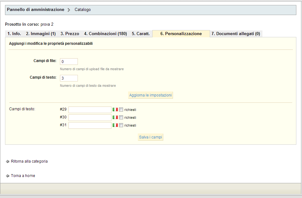 cavin Posted April 11, 2013 Share Posted April 11, 2013 Ciao ragazzi, sto personalizzando un sito su base prestashop, ma ho difficoltà nel rintracciare il sorgente relativo ad una pagine del pannello di amministrazione. Nel dettaglio parlo del catalogo e mi servirebbe modifcare il tab6 (personalizzazione) del prodotto. Se non è chiaro: catalogo -> prodotto -> tab6 (6. personalizzazione). in allegato una print che chiarisci a quale punto mi riferisco. Vorrei modificarlo in modo che il campi di testo siano prefissati e non dinamici. Sapete aiutarmi?? grazie 1 Link to comment Share on other sites More sharing options...