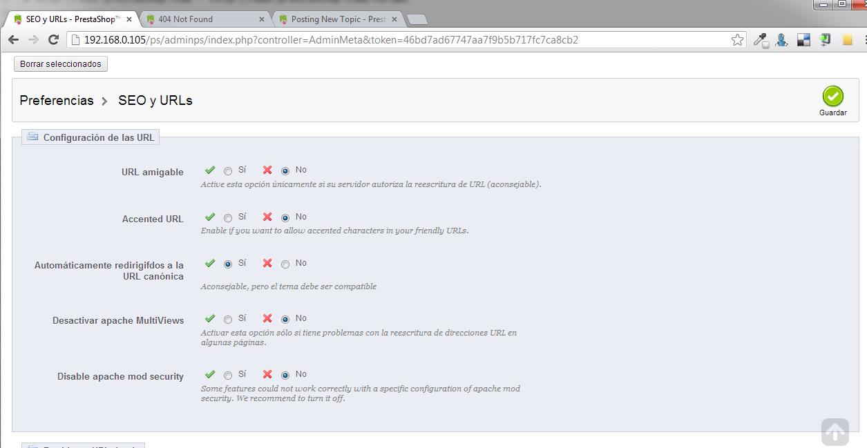 jotraverso Posted April 12, 2013 Share Posted April 12, 2013 (edited) Buenos días, Me llamo Jorge, estoy comenzando con Prestashop y tras haber dedicado unas cuantas horas (más de 10) a buscar soluciones a este problema que se me plantea he decidido preguntar en el Foro, ya que aunque hay varios posts relacionados con esto, son para versiones 1.4 y algunas tratan la 1.5.3 pero no he conseguido resolverlo. Os cuento: Tengo una instalación Prestashop 1.5.4.0 out-of-the-box, instalada en el directorio /ps de mi apache, y al activar las URL Amigables se genera el fichero .htaccess con reglas para la redirección de las imágenes principalmente, pero el front office no funciona, me explico: Cuando tengo varios idiomas activados, accedo a 192.168.0.105/ps/ y me redirecciona con código 301 a 192.168.0.105/ps/es/ y me sale la página de 404 de apache, no la de prestashop (así que parece que la regla de redirección a 404 no se llega a ejecutar). Cuando dejo activado sólo el idioma español, me carga la página principal, pero no me carga ninguna imagen de artículo ni tampoco puedo acceder a ellos, ni categoría, ni ninguna página CMS. Espero que alguien pueda echarme una mano, os dejo aquí el contenido del .htaccess antes y después de activar la "URL amigables" y capturas de la config SEO. Muchas gracias por adelantado y saludos!! Contenido de .htaccess antes de activar "URL Amigables" # ~~start~~ Do not remove this comment, Prestashop will keep automatically the code outside this comment when .htaccess will be generated again # .htaccess automaticaly generated by PrestaShop e-commerce open-source solution # http://www.prestashop.com - http://www.prestashop.com/forums<IfModule mod_rewrite.c> RewriteEngine on RewriteCond %{HTTP_HOST} ^192.168.0.105$ RewriteRule . - [E=REWRITEBASE:/ps/] RewriteRule ^api/?(.*)$ %{ENV:REWRITEBASE}webservice/dispatcher.php?url=$1 [QSA,L] # AlphaImageLoader for IE and fancybox RewriteCond %{HTTP_HOST} ^192.168.0.105$ RewriteRule ^images_ie/?([^/]+)\.(jpe?g|png|gif)$ js/jquery/plugins/fancybox/images/$1.$2 [L] </IfModule>#If rewrite mod isn't enabled ErrorDocument 404 /ps/index.php?controller=404 # ~~end~~ Do not remove this comment, Prestashop will keep automatically the code outside this comment when .htaccess will be generated again Config de SEO Contenido .htaccess después de activar "URL Amigables" # ~~start~~ Do not remove this comment, Prestashop will keep automatically the code outside this comment when .htaccess will be generated again # .htaccess automaticaly generated by PrestaShop e-commerce open-source solution # http://www.prestashop.com - http://www.prestashop.com/forums<IfModule mod_rewrite.c> RewriteEngine on RewriteCond %{HTTP_HOST} ^192.168.0.105$ RewriteRule . - [E=REWRITEBASE:/ps/] RewriteRule ^api/?(.*)$ %{ENV:REWRITEBASE}webservice/dispatcher.php?url=$1 [QSA,L] # Images RewriteCond %{HTTP_HOST} ^192.168.0.105$ RewriteRule ^([0-9])(\-[_a-zA-Z0-9-]*)?(-[0-9]+)?/.+\.jpg$ %{ENV:REWRITEBASE}img/p/$1/$1$2$3.jpg [L] RewriteCond %{HTTP_HOST} ^192.168.0.105$ RewriteRule ^([0-9])([0-9])(\-[_a-zA-Z0-9-]*)?(-[0-9]+)?/.+\.jpg$ %{ENV:REWRITEBASE}img/p/$1/$2/$1$2$3$4.jpg [L] RewriteCond %{HTTP_HOST} ^192.168.0.105$ RewriteRule ^([0-9])([0-9])([0-9])(\-[_a-zA-Z0-9-]*)?(-[0-9]+)?/.+\.jpg$ %{ENV:REWRITEBASE}img/p/$1/$2/$3/$1$2$3$4$5.jpg [L] RewriteCond %{HTTP_HOST} ^192.168.0.105$ RewriteRule ^([0-9])([0-9])([0-9])([0-9])(\-[_a-zA-Z0-9-]*)?(-[0-9]+)?/.+\.jpg$ %{ENV:REWRITEBASE}img/p/$1/$2/$3/$4/$1$2$3$4$5$6.jpg [L] RewriteCond %{HTTP_HOST} ^192.168.0.105$ RewriteRule ^([0-9])([0-9])([0-9])([0-9])([0-9])(\-[_a-zA-Z0-9-]*)?(-[0-9]+)?/.+\.jpg$ %{ENV:REWRITEBASE}img/p/$1/$2/$3/$4/$5/$1$2$3$4$5$6$7.jpg [L] RewriteCond %{HTTP_HOST} ^192.168.0.105$ RewriteRule ^([0-9])([0-9])([0-9])([0-9])([0-9])([0-9])(\-[_a-zA-Z0-9-]*)?(-[0-9]+)?/.+\.jpg$ %{ENV:REWRITEBASE}img/p/$1/$2/$3/$4/$5/$6/$1$2$3$4$5$6$7$8.jpg [L] RewriteCond %{HTTP_HOST} ^192.168.0.105$ RewriteRule ^([0-9])([0-9])([0-9])([0-9])([0-9])([0-9])([0-9])(\-[_a-zA-Z0-9-]*)?(-[0-9]+)?/.+\.jpg$ %{ENV:REWRITEBASE}img/p/$1/$2/$3/$4/$5/$6/$7/$1$2$3$4$5$6$7$8$9.jpg [L] RewriteCond %{HTTP_HOST} ^192.168.0.105$ RewriteRule ^([0-9])([0-9])([0-9])([0-9])([0-9])([0-9])([0-9])([0-9])(\-[_a-zA-Z0-9-]*)?(-[0-9]+)?/.+\.jpg$ %{ENV:REWRITEBASE}img/p/$1/$2/$3/$4/$5/$6/$7/$8/$1$2$3$4$5$6$7$8$9$10.jpg [L] RewriteCond %{HTTP_HOST} ^192.168.0.105$ RewriteRule ^c/([0-9]+)(\-[\.*_a-zA-Z0-9-]*)(-[0-9]+)?/.+\.jpg$ %{ENV:REWRITEBASE}img/c/$1$2$3.jpg [L] RewriteCond %{HTTP_HOST} ^192.168.0.105$ RewriteRule ^c/([a-zA-Z_-]+)(-[0-9]+)?/.+\.jpg$ %{ENV:REWRITEBASE}img/c/$1$2.jpg [L] # AlphaImageLoader for IE and fancybox RewriteCond %{HTTP_HOST} ^192.168.0.105$ RewriteRule ^images_ie/?([^/]+)\.(jpe?g|png|gif)$ js/jquery/plugins/fancybox/images/$1.$2 [L]# Dispatcher RewriteCond %{REQUEST_FILENAME} -s [OR] RewriteCond %{REQUEST_FILENAME} -l [OR] RewriteCond %{REQUEST_FILENAME} -d RewriteCond %{HTTP_HOST} ^192.168.0.105$ RewriteRule ^.*$ - [NC,L] RewriteCond %{HTTP_HOST} ^192.168.0.105$ RewriteRule ^.*$ %{ENV:REWRITEBASE}index.php [NC,L] </IfModule> #If rewrite mod isn't enabled ErrorDocument 404 /ps/index.php?controller=404# ~~end~~ Do not remove this comment, Prestashop will keep automatically the code outside this comment when .htaccess will be generated again Config de SEO Edited April 12, 2013 by jotraverso (see edit history) Link to comment Share on other sites More sharing options...