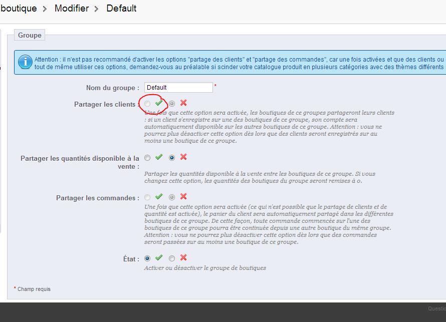 Vincent Terenti Posted September 16, 2013 Share Posted September 16, 2013 Bonjour CharlyAes32, Avez-vous vraiment coché l'option de partage des clients pour les boutiques de votre groupe avant la création de la boutique? Car si vous ne l'avez pas fait en amont, effectivement ça n'est plus modifiable après coup (comme écrit dans le texte d'information de l'option) Bien cordialement, Link to comment Share on other sites More sharing options...