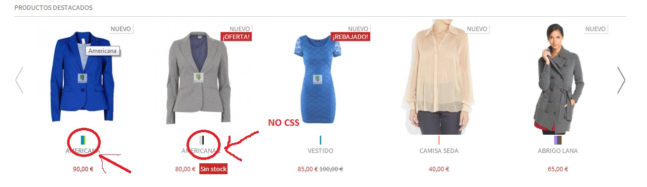 Hola, tengo un problema un poco raro, en los slide que tengo en inicio, hasta ahora me a funcionado todo bien pero e hecho unas modificaciones para que me salgan los colores debajo de cada articulo, y me salen solo que no coge los valores de css que le tengo puestos, en el product list si me los coge y lo raro es que estan en el mismo archivo css que el de "sin stock" y ese si lo coge el slide.