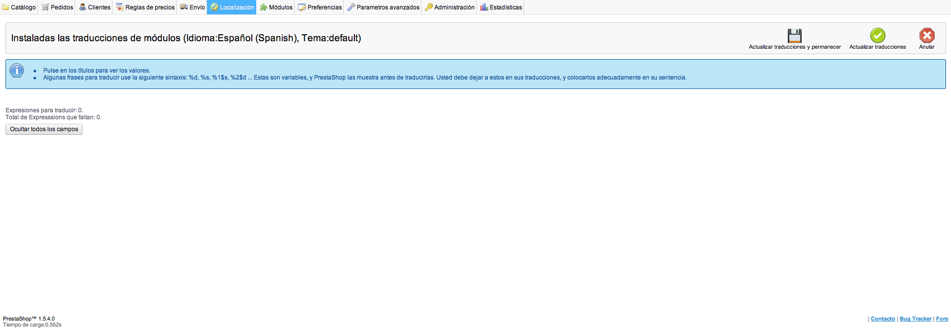 gombau Posted April 19, 2013 Share Posted April 19, 2013 Hola a todos, he realizado la actualización a la versión 1.5.4 stable de prestashop y me he encontrado con una cosa bastante rara, los módulos se han puesto en inglés, utilizo un tema distinto del "default" que tiene sus propias traducciones que de paso os cuento que han desaparecido todas y he tenido que rehacerlas pero bueno eso no es el problema, la próxima vez guardaré la traducción antes de actualizar (envejeciendo y aprendiendo)... El problema es que hay partes que no puedo traducir, el tema tiene alguno módulos propios, pero otros los toma del tema por defecto como hacen casi todos, y hay es donde aparece el problema, al ir a revisar las traducciones del tema "default" me encuentro con que no hay NADA!!! Podeis ver en la imagen adjunta que no aparece nada en la lista de traducciones para el apartado módulos!!! No se como proceder... alguien ha tenido este mismo problema? lo habéis podido solucionar? Mi site es http://shop.singularshirts.com Link to comment Share on other sites More sharing options...