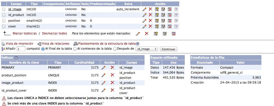 atanatosweb Posted April 24, 2013 Author Share Posted April 24, 2013 Hola. He vuelto a seguir tus pasos, y se siguen sin ver las imágenes. Todo lo demás se importa bien, pedidos, precios, productos...pero las imágenes no se ven. He exportado las tablas ps_images y ps_images_lang de la web vieja e importarlo a la nueva, pero sigue sin funcionar. En el mysql de 1and1, en la tabla de images y images_lang da un error que en OVH no da, pone "Las claves PRIMARIA en INDICE no deben de seleccionarse juntas para la columna ìd_image´" y "Se creo mas de una clave INDEX para la columna ìd_prodcut`. Puede que el error esté ahí. Gracias por las respuestas. Link to comment Share on other sites More sharing options...