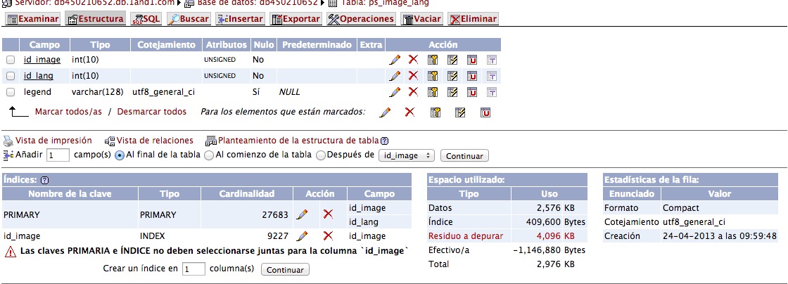jaloise Posted April 24, 2013 Share Posted April 24, 2013 Hola. He vuelto a seguir tus pasos, y se siguen sin ver las imágenes. Todo lo demás se importa bien, pedidos, precios, productos...pero las imágenes no se ven. He exportado las tablas ps_images y ps_images_lang de la web vieja e importarlo a la nueva, pero sigue sin funcionar. En el mysql de 1and1, en la tabla de images y images_lang da un error que en OVH no da, pone "Las claves PRIMARIA en INDICE no deben de seleccionarse juntas para la columna ìd_image´" y "Se creo mas de una clave INDEX para la columna ìd_prodcut`. Puede que el error esté ahí. Gracias por las respuestas. Probaste hacer una vez en local, para ver si el problema es del hosting o de la base de datos?? intenta con el wamp... Link to comment Share on other sites More sharing options...