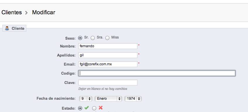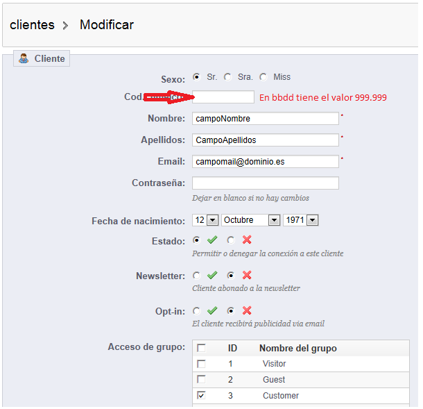 himar Posted April 25, 2013 Author Share Posted April 25, 2013 Das en el clavo a la primera egomezpe, en el renderForm de /controllers/admin/AdminCustomerController.php había puesto codigo_cliemte. Efectivamente si el nombre coincide en el formulario y en el objeto, se establece el valor automáticamente. Mil gracias por las explicaciones y la concreción, todo funcionando de primera. Link to comment Share on other sites More sharing options...
