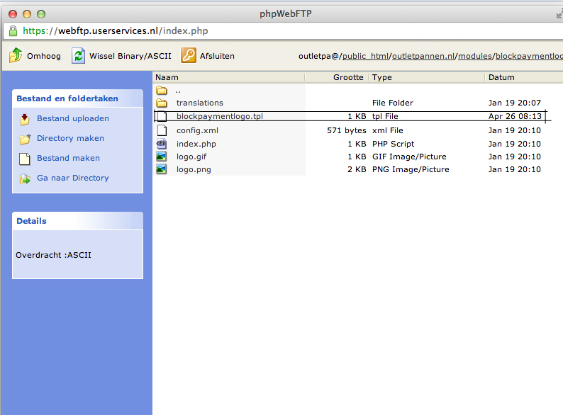 scorpionsworld Posted April 29, 2013 Share Posted April 29, 2013 Beste forumleden, ik heb zojuist via dit forum achterhaald dat ik door de codering te veranderen van de 'blockpaymentlogo.tpl' met als toevoeging <img src="{$img_dir}logo_paiement_ideal.jpg" alt="ideal" width="33" height="21" /> het Ideal logo zichtbaar wordt op mijn pagina's in de betalingsblok. Vervolgens een afbeelding met dezelfde naam toegevoegd aan de map IMG in themes. Alles juist volgens mij. Nu heb ik dit gedaan op mijn mac via teksteditor. Ik sla het document op (als .tpl, nadat ik een melding heb gehad dat dit niet herkend is) en upload hem naar de server. Na dit gedaan te hebben is het icoontje van originele staat een wit icoontje en is de gehele module verdwenen! (Onherkenbaar). Elke keer als ik het open lees ik dezelfde codering maar bij het opslaan lijkt hij het anders te verwerken. Kan iemand mij helpen? Ik heb een screenshot toegevoegd van de desbetreffende map. Ik ben nog een beginner met de coderingen dus het kan goed zijn dat ik wat fout heb gedaan. Alvast enorm bedankt! Gezien de screenshot is er niks mis met de extensie voor het template bestand. Echter, ik mis het blockpaymentlogo.php bestand. Dit is HET module scriptbestand. zonder php file geen werkende module Link to comment Share on other sites More sharing options...