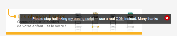 iboud Posted April 26, 2013 Share Posted April 26, 2013 Bonjour à tous, Merci de votre lecture, J'ai un message qui est arrivé sur mon site (voir image joint) et je ne comprend pas ca provenance. J'ai du mal à identifier sa source dans le code et je voudrais savoir si quelqu'un sait comment je peux enlever ce message qui fait fuire mes potentielles clients ? Please stop hotlinking my easing script — use a real CDN instead. Many thanks Merci à tous Link to comment Share on other sites More sharing options...