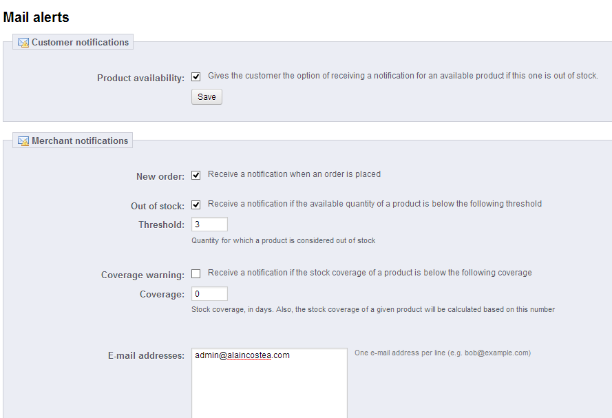 Alain Costea Posted April 27, 2013 Share Posted April 27, 2013 (edited) Hello, I must enter 3 emails for shop contact. In the back office, to store contact, I can enter only one. I tryied with commas, space, but it doesn't work. Is there a way to do that? Thank you. Edited April 27, 2013 by Alain Costea (see edit history) Link to comment Share on other sites More sharing options...