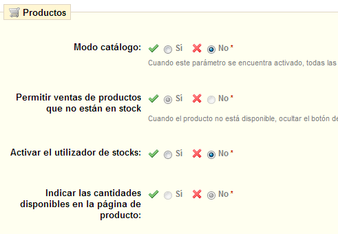 DannyEL Posted April 30, 2013 Share Posted April 30, 2013 (edited) Si quieres trabajar la tienda sin stock, es decir, vender siempre los artículos sin estar pendiente de la cantidad disponible de la tienda online. Por esto, tienes que entrar en el Admin/Preferencias/Productos. Allí tienes que cambiar unas opciones. Te dejo una captura de pantalla con los cambios. Saludos, Daniel Edited April 30, 2013 by DannyEL (see edit history) Link to comment Share on other sites More sharing options...