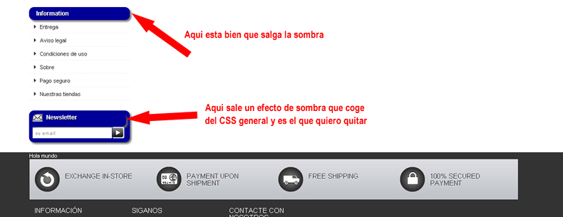 Sergio Ruiz Posted May 1, 2013 Share Posted May 1, 2013 blocknewsletter.css #newsletter_block_left .title_block, #newsletter_block_left h4 { padding: 0 0 12px 28px; color: #FFF; text-shadow: 0 1px 0 #000; background: url(img/icon/newsletter.png) no-repeat 0 0 transparent; } Por #newsletter_block_left .title_block, #newsletter_block_left h4 { padding: 0 0 12px 28px; color: #FFF; text-shadow: 0 1px 0 #000; background: url(img/icon/newsletter.png) no-repeat 0 0 transparent; box-shadow: none; } Link to comment Share on other sites More sharing options...