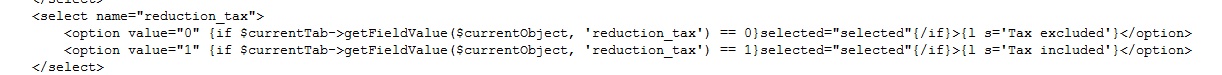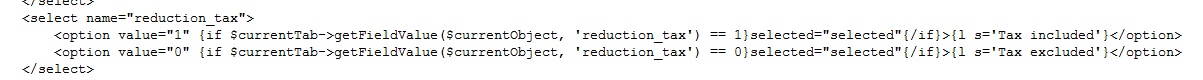 ossy Posted May 2, 2013 Author Share Posted May 2, 2013 (edited) He encontrado donde esta el .tpl y lo he modificado, lo explico: Vamos a: /httpdocs/"carpeta de vuestro admin la 1ª que sale"/themes/default/template/controllers/cart_rules/actions.tpl Dentro de actions.tpl, buscamos la zona de select name="reduction_tax" y cambiamos de orden las dos lineas que están debajo de ese select, así cambiaremos el orden de la lista desplegable y por defecto nos saldrá la tasa incluida. Dejo una imágenes del antes y el después. Cambio esto y el orden en la lista desplegable se cambia, pero al generar los códigos de apadrinamiento y fidelidad, me los sigue generando con las tasas excluidas. Así que la opcion de 0 o 1 vendra del propio módulo. Ya no se donde mirar. Edited May 2, 2013 by ossy (see edit history) Link to comment Share on other sites More sharing options...