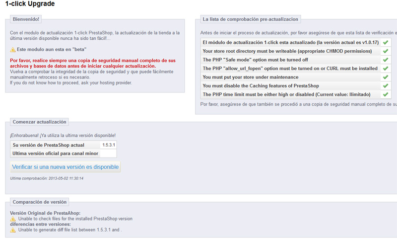 damnboy Posted May 2, 2013 Share Posted May 2, 2013 Hola de nuevo a todos. Venía comentando otros problemas en otro post referente a codificaciones de caracteres y el servicio de atención al cliente, pero por lo que he podido comprobar la nueva versión 1.5.4.1 corrige estos errores (actualmente estoy en 1.5.3.1). Debido a esto me he decidido a actualizar, pero una vez puesto este módulo (está actualizado) no reconoce que hay una versión nueva y me indica que tengo la última, además de dar un par de errores por bajo que dicen que no puede realizar un par de cosas (ahora pongo la foto). Sí que tengo habilitada la variable de comunicación que permite a la tienda detectar si hay nueva versión ya que expresamente la habilité para que al inicio del back-office me avisara si hay una nueva versión (y está funcionando). A alguien le ha sucedido lo mismo? No he encontrado ninguna solución por google o por aquí. Link to comment Share on other sites More sharing options...