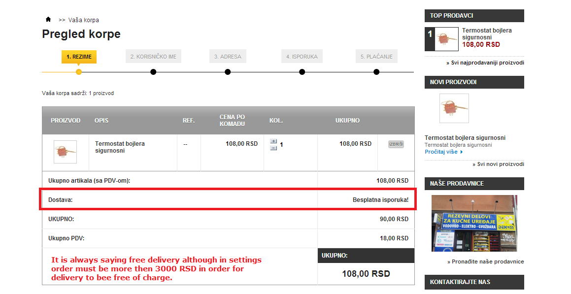 Dolke Posted May 2, 2013 Share Posted May 2, 2013 Hi to all once again, I have some new issues on the way to full functional estore. As you can see from the printscreen below it is always showing me free delivery in the shopping cart. I dont know why is that. I put that free delivery is only if order is more then 3000 RSD Any ideas? Ty in advance Dean Link to comment Share on other sites More sharing options...