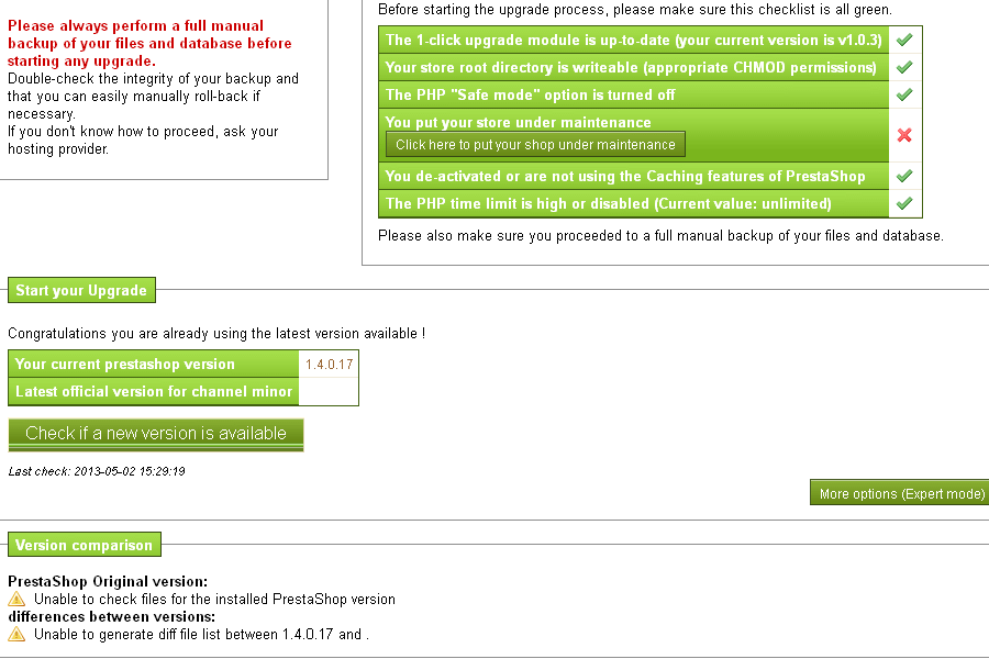 Festival Trade Posted May 2, 2013 Share Posted May 2, 2013 Hello. If am posting in the wrong place please move this topic and direct me into the right info. I try to update my store and I get this: Congratulations you are already using the latest version available ! Your current prestashop version 1.4.0.17 Last check: 2013-05-02 15:29:19 (Under I have this ) Version comparison PrestaShop Original version: Unable to check files for the installed PrestaShop version differences between versions: Unable to generate diff file list between 1.4.0.17 and . I did download the upgrade module but still not updating even I see in the link in the page conner (1-click upgrade) I actually have no complaines about this version I have. All works fine but am worried about security issues, thats the only reason I look for the upgrade... should I ? If so... whats wrong here ? Why my store show ,I have the latest version and is not ? Help me please. Link to comment Share on other sites More sharing options...