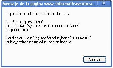 ventura90 Posted May 2, 2013 Share Posted May 2, 2013 Datos a conocer: hice un traslado de dominio, al nuevo dominio "www.informaticaventura.com" desde "sargon.hol.es" e instalé desde 0 el prestashop 1.5.4 , borré la BD de informaticaventura recien instalado e importé la BD de sargon.hol.es (hice los cambios en las tablas, etc) y por último subí las carpetas siguientes: modulos, themes, img y mails. Probé también a subir la carpeta "classes" y smarty de tools (por el error) pero da otro error mas gordo aún... Enlace: http://www.informaticaventura.com ¡Prueben a añadir un producto! (VER FOTO DEL ERROR) Gracias de antemano por la ayuda! Link to comment Share on other sites More sharing options...