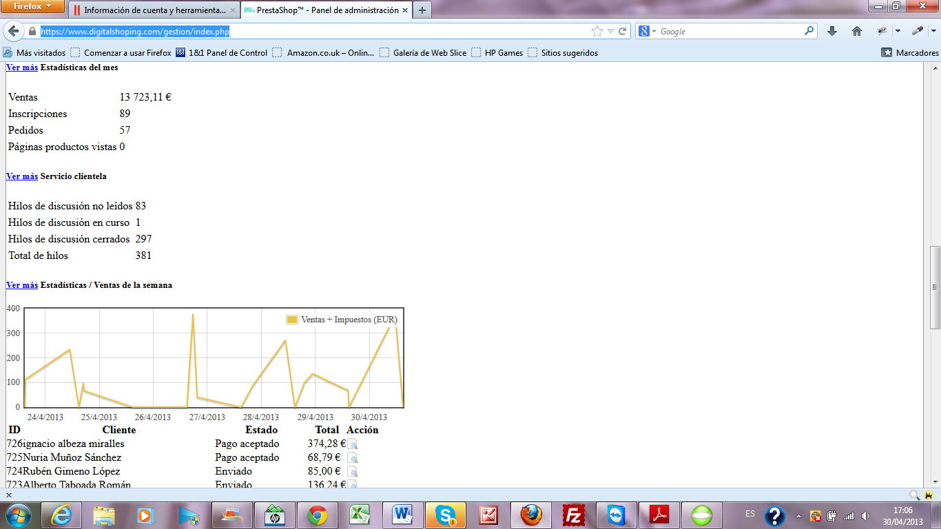 Digitalshoping Posted May 3, 2013 Share Posted May 3, 2013 (edited) Buenas! Espero que alguien me pueda ayudar. Mi backoffice se ha desconfigurado, los distintos paneles campan a sus anchas por toda la pantalla y el tipo de letra es distinto. He estado buscando por el foro pero el unico que tuvo un problema similar era por la visualización del backoffice en distintos navegadores, pero este no es mi problema, ya que en google chrome abro en modo incógnito (sin cookies) y se ve igual el problema que en firefox. Esto ocurrió desde que la base de datos se migró a otro servidor y se activó un certificado ssl para la tienda, que está en https://www.digitalshoping.com Por la razón que sea el backoffice se empezó a ver mal, ya desde el acceso al backoffice (donde pones la contraseña para entrar). En el soporte técnico de Loading (donde se aloja la base de datos en un hosting compartido) me han dicho lo que a mí me parece también: que es un fallo del css u hoja de estilos del backoffice....ya que el frontoffice se visualiza perfectamente. He intentado encontrar ese css del backoffice para restaurar unicamente eso a una versión anterior y que vuelva a verse bien, pero no sé dónde está. No me interesa restaurar la base de datos entera porque perdería clientes, pedidos, etc....y si lo único que hay que cambiar es la forma en que se visualiza la plantilla, es una tontería restaurar todo. Alguien puede decirme cómo puedo solucionarlo? Adjunto unos pantallazos para que veáis lo mal que se ve el backoffice ahora. Muchas gracias de antemano por vuestra ayuda. Edited May 7, 2013 by Digitalshoping (see edit history) Link to comment Share on other sites More sharing options...