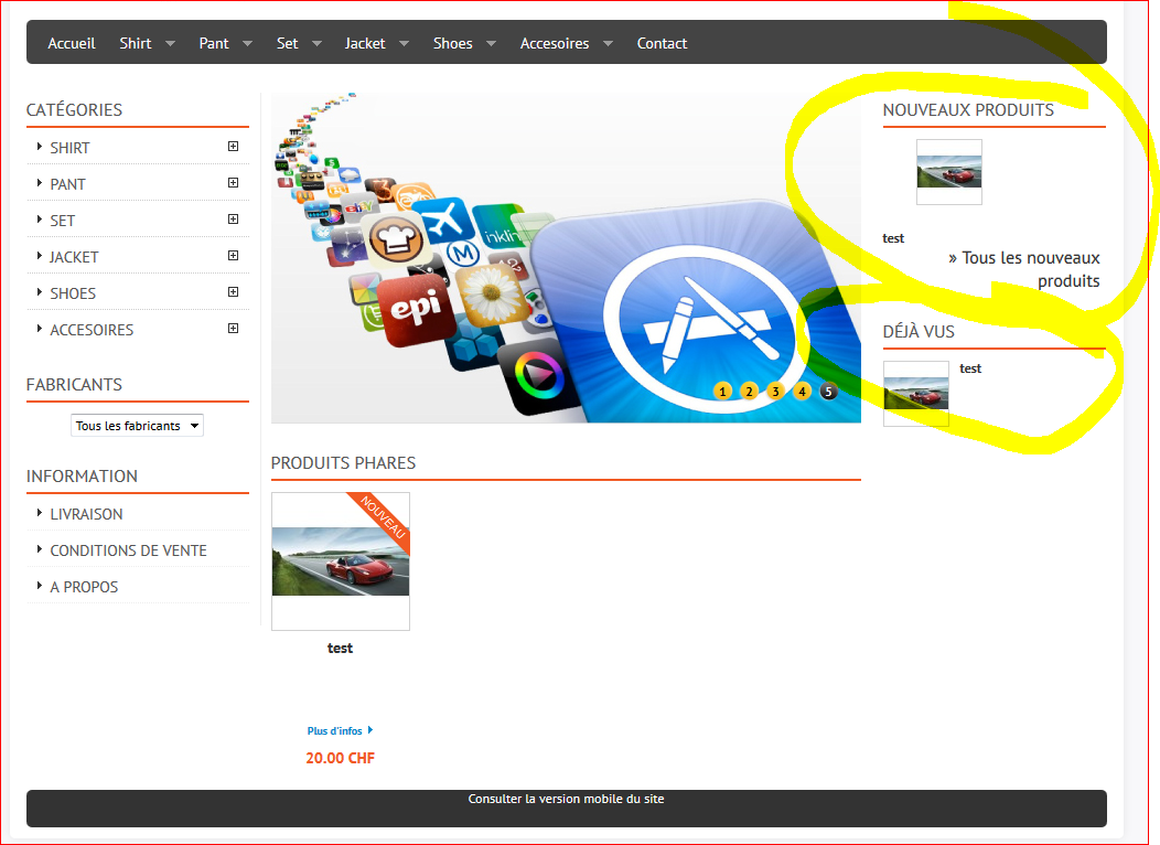 diggy Posted May 3, 2013 Share Posted May 3, 2013 (edited) Bonjour, Je voudrais modifier mon bloc Nouveaux produits, mais je ne sais pas comment le faire. Voici ce que je souhaites : Que l'image et le texte soit alignés comment sous le bloc déjà vus Que comme dans le bloc Produits Phares, le lien "plus d'infos" soit présent Que dans le bloc Nouveaux produits, les différents produits soient présentés un sous l'autre (image, texte, lien) Merci de votre aide, David Edited May 10, 2013 by diggy (see edit history) Link to comment Share on other sites More sharing options...