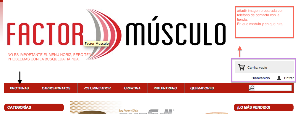DcdacD Posted May 3, 2013 Share Posted May 3, 2013 (edited) Buenas noches, ya me estoy volviendo loco y al final tengo que preguntar, tras revisar informacion al respecto en google e intentar modificar "sin éxito" el global.css y el blockeruserinfo.css pregunto: Como puedo hacer cuadrar el logo, a la derecha una imagen que tengo de contacto con la tienda, y justo debajo el menu horizontal ?? He intentado añadir una imagen al css del blockeruserinfo con background pero no me hacía caso, imagino que deberé de añadir algo más {}. Tengo algun problemas más que otro pero iremos por partes. El añadir un menu horizontal es porque tuve problemas al mover el bloque de busqueda rápida y el menu de ofertas regresivas (éste si lo movia a la columna de la derecha, la cuenta atrás no funcionaba) . La web es www.factormusculo.com (Prestashop 1541) añado imagen por si no me he explicado bien. Una vez todo cuadrado, no me gustaría que hubiese demasiado espacio entre el logo y las columnas (center, left y right). Edited May 6, 2013 by DcdacD (see edit history) Link to comment Share on other sites More sharing options...