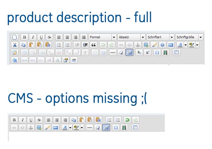burgi Posted May 6, 2013 Share Posted May 6, 2013 Hi! The mce-toolbar over CMS-sites are missing a lot of options in my 1.5.4 PrestaShop. In the article description I have all the mce-options available, but in CMS only the basics are shown (bold, alignment, text-color) but not even headers and paragraphs. Are there any options on the mce-editor/toolbar? Thanks a lot for your help! Link to comment Share on other sites More sharing options...