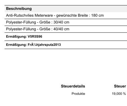 w4dl Posted May 7, 2013 Share Posted May 7, 2013 Ich habe einen Gutschein "Frühjahrsputz2013" generiert, mit dem Kunden bei Bestellungen befristet 10% Rabatt erhalten. Soweit alles in Ordnung, allerdings wird das "ü" des Gutscheins auf der Rechnung falsch dargestellt (sh. Screenshot). Kann mir jemand sagen, ob und wo sich das im Backoffice beheben lässt? Prestashop 1.4.8.2 Link to comment Share on other sites More sharing options...