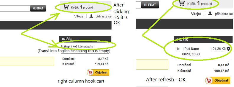 mir69 Posted May 11, 2013 Share Posted May 11, 2013 Hello, I was as well setting the cart for hours.... Just write to you my result. The cart module should be hooked only in pages header, and top of pages. Or should be hooked only in pages header, and left / or right culumns. Than it works fine, showing no.of items , refreshing the total of products after deleting one of items from the cart as well. If the cart module is hooked in page header, top of pages and as well in left / or right culumns, there will be some errors - like I have, refreshing update only after additional page refresh, or after another "delete item" button. This is my setting on fresh instal PS 1.5.4.1, will see how it goes with new template. Miro. Link to comment Share on other sites More sharing options...