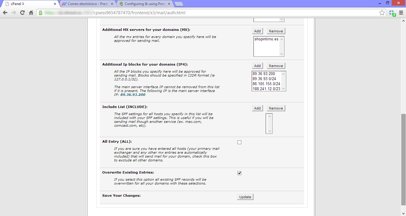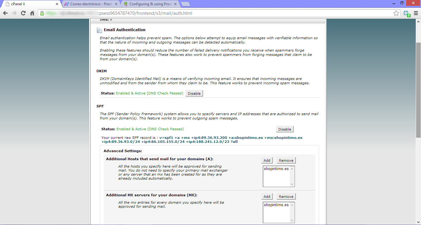 I’ve tried all kind of settings but email still goes in spam folder. Also I’ve tried to configure my Prestashop server, and trough cPanel but still doesn’t work. Here I let you some print screen to see what is all about.
