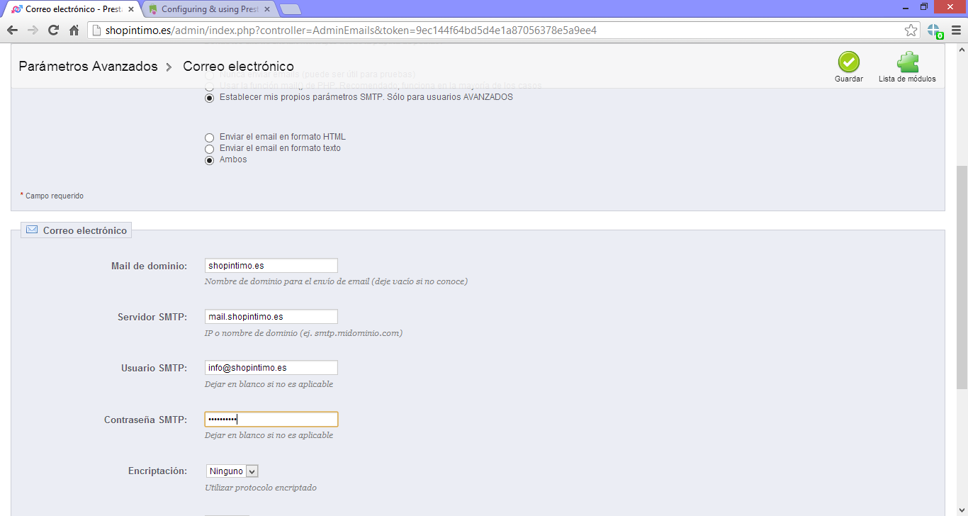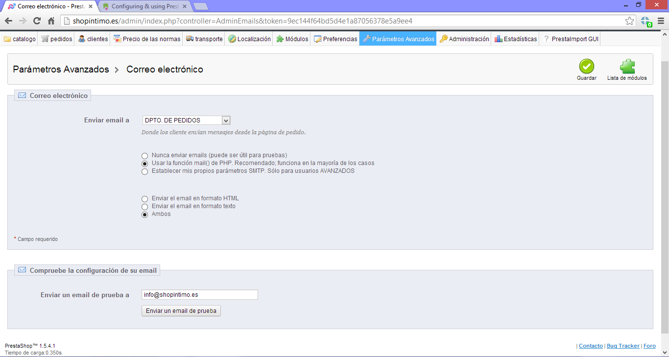 2nd: Using Prestashop to send mails with SMTP settings (loggin with user&pass of the info@ account):