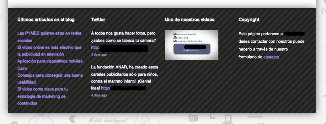 nadie Posted May 13, 2013 Share Posted May 13, 2013 Hola a tod@s, Necesitaría hacer un efecto visual en el footer de la tienda que estoy montando ( acompaño imagen) , que es una pequeña imagen que se repite por todo el footer, (la cual está ubicada en la misma carpeta del servidor) He puesto la siguiente instrucción en el primer div: de global.css: #footer { background: url(diag.png) repeat-x scroll left top transparent;} pero no va. un saludo y gracias. Lo primero de todo fijate que la imagen, la tengas subida en la ruta, si tu colocas un fondo asi: background:url('../img/nadie.png'); La imagen nadie.png, la tienes que tener metida dentro del directorio: /themes/tu-plantilla/img/ 1 Link to comment Share on other sites More sharing options...