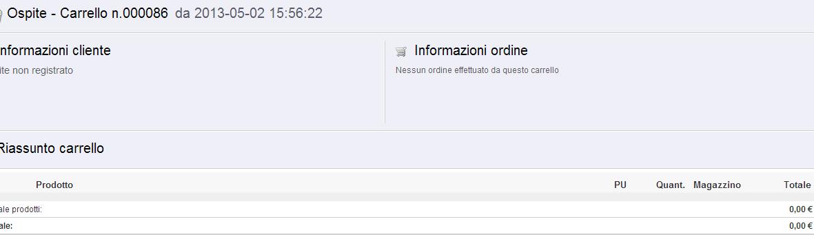 cuccioli d'uomo Posted May 14, 2013 Share Posted May 14, 2013 Salve, ma quando gli ospiti (guest) abbandonano i carrelli, è normale che non vedo i prodotti messi nel carrello? I miei carrelli abbandonati sono tutti così. allego delle foto per esempio. Grazie Francesco Link to comment Share on other sites More sharing options...