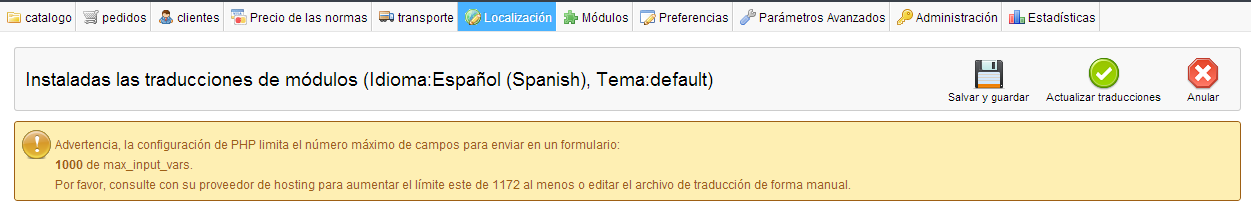 nadie Posted May 16, 2013 Share Posted May 16, 2013 Hola, Estoy intentando modificar las traducciones de la Localización y al darle a la siguiente traducción no me aparecen las traducciones a modificar, me aparece el siguiente mensaje informativo y no puedo modificar los mensajes. Sabéis qué le puede pasar? Gracias! Sergi. Como supongo que no tendras permisos para modificar el php.ini original al menos si estas en un hosting compartido, prueba crear un fichero llamado php.ini y introduce esto: max_input_vars=6000; Mételo dicho fichero en la carpeta de administración de tu tienda. Y si te sigue sin funcionar, contacta con tu hosting para que te aumenten dicho valor. Link to comment Share on other sites More sharing options...