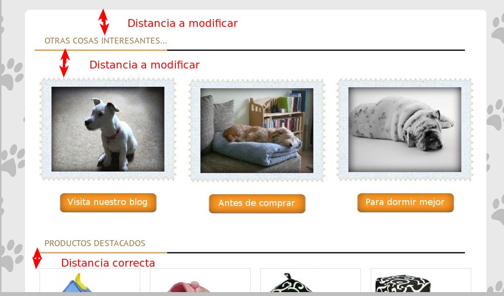 nadie Posted May 16, 2013 Share Posted May 16, 2013 Hola, La acabo de activar http://amazingdogbeds.com Gracias y S2!! Prueba esto. Fichero: http://amazingdogbeds.com/themes/furniture_shop/css/modules/editorial/editorial.css Añade esto: #editorial_block_center .wrapper { margin-top: 0px; } Fichero: http://amazingdogbeds.com/themes/furniture_shop/css/modules/editorial/editorial.css Añade esto: #editorial_block_center { margin-top: -25px; } Link to comment Share on other sites More sharing options...