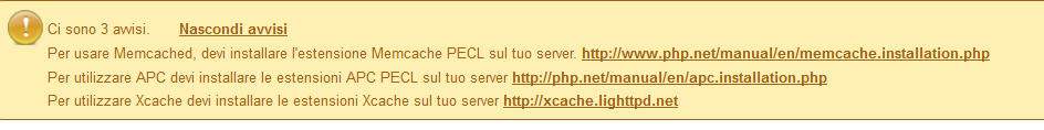 dvanet Posted May 25, 2013 Share Posted May 25, 2013 Daniele....non puoi attivarle...o il tuo hosting ha da offrirti queste features, oppure no Pero' puoi scegliere di usare come cache il sistema di file, invece che memcache Ciao Stefa, ho scritto all'assistenza penso che loro sappiano come applicare le modifiche. Il sistema di file mi dà questo avviso: Il sistema di CacheFS può essere utilizzata solo quando il sistema contiene solo un server. Chiedi al tuo provider se non sei sicuro. quindi mi devo rimettere a loro. ti faccio sapere. sai invece come migliorare il database dal pannello di controllo myadminphp? grazie mille Dani Link to comment Share on other sites More sharing options...