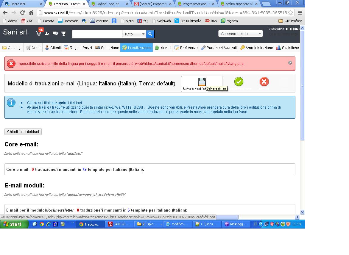 Ps. 1.5.4 vorrei tradurre i testi di alcune mail, ma quando provo a farlo mi appare l'errore in allegato :" IMPOSSIBILE SCRIVERE IL FILE DELLA LINGUA PER I SOGGETTI E-MAIL , IL PERCORSO E' : ..... ecom/themes/default/mails/it/lang.php