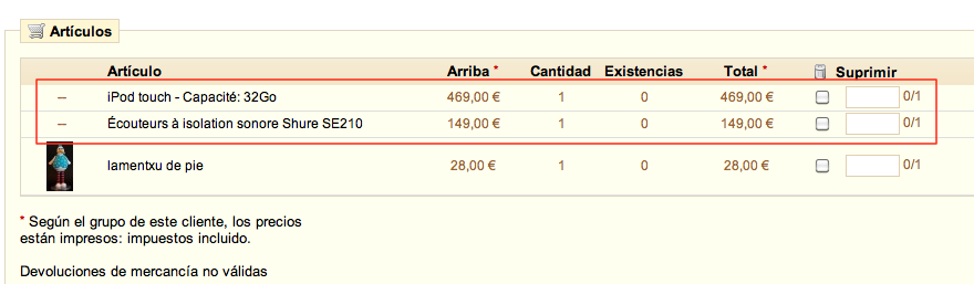 kintela Posted May 24, 2013 Author Share Posted May 24, 2013 Hola Esos es lo primero que hice cuando me puse a configurar mi tienda. Borré todos los artículos y empezé a crear mi propio catalogo y de hecho en el catálogo no veo esos 2 elementos que se me han colado. El caso es aue he eliminado el pedido entero y he creado otro nuevo con un solo artículo y ahora se me cuela de regalo otro artículo de mi propio catálogo que yo no he seleccionado y encima en el email que manda me aparece sin la descripción de los artóculoa, el mio y el que pone él de regalo y en el detalle del pedido desde el panel de control no me los suma, pero en la factura si. Vamos un p..cristo que no se como meter mano la verdad Un saludo Link to comment Share on other sites More sharing options...