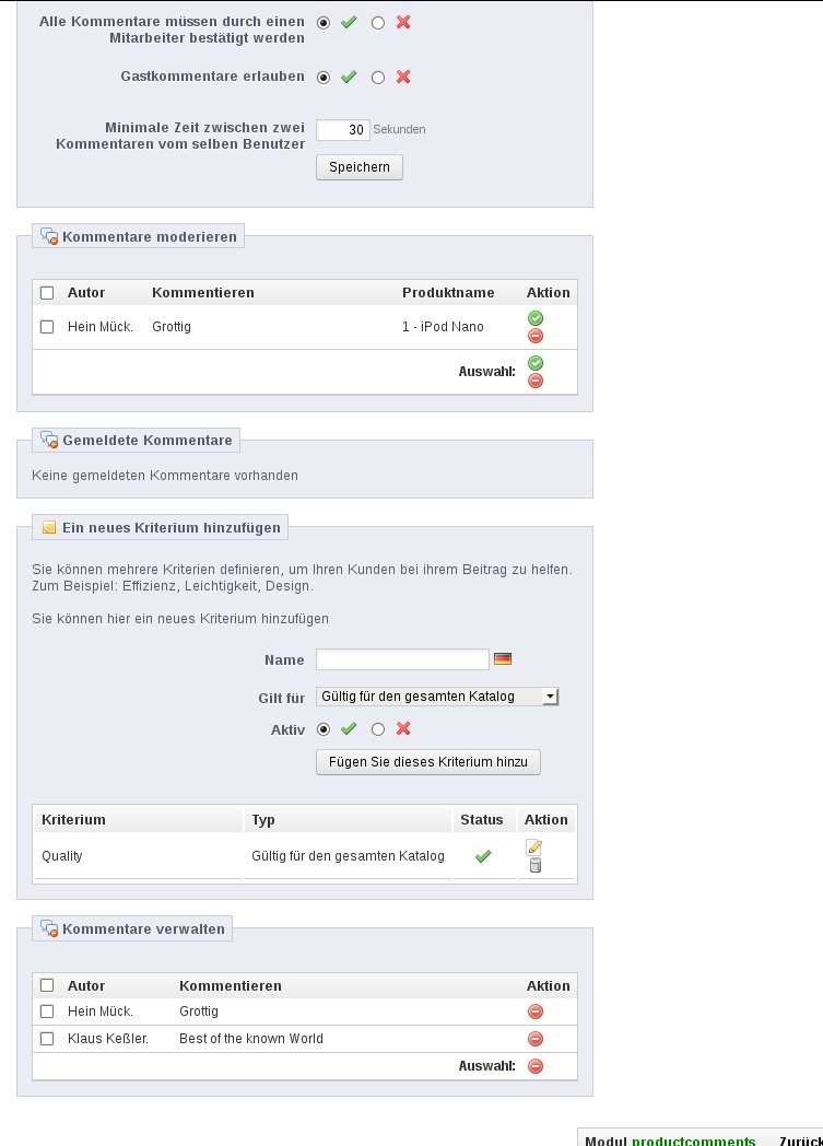 Lockesoft Posted May 24, 2013 Share Posted May 24, 2013 Habe mir das eben mal in einem Testshop angesehen. die Stelle, an der bei dem Modul die vorhandenen Bewertungen / Kommentare gelistet werden ist in dem Screenshot gar nicht sichtbar. Wobei ich allerdings anmerken muss, dass mein Testshop die Modulversion 2.3 verwendet. Auf dem Screen ist nur die Stelle zu sehen, an der neue Kommentare freigeschaltet oder abgelehnt werden können. Dort ist nach dem Erlauben oder Verbieten allerdings nicht mehr zu sehen. Hier mal ein Screenshot dazu: Oben ein Kommentar, der noch moderiert werden muss und unten inklusive eines alten Kommentars dann zwei Kommentare. Ich hoffe, dass sich bei dem Modul von Version 2.1 bis 2.3 nicht soviel geändert hat, dass diese Aussage auch vorher bereits passt. LG Klaus / Lockesoft Link to comment Share on other sites More sharing options...