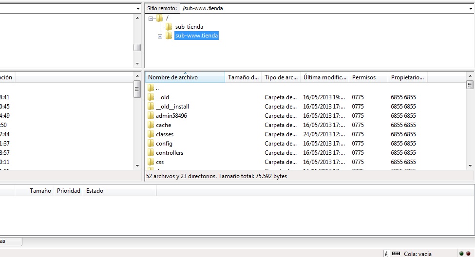 La Botavara Posted May 24, 2013 Author Share Posted May 24, 2013 Entonces, creo que no estas moviendo los ficheros al directorio correcto. Adjunto una foto de mi ftp. Mi tienda esta en la subcarpeta sub-www.tienda, y lo único que hago es arrastrar todas las carpetas que contiene a la carpeta " / " Link to comment Share on other sites More sharing options...