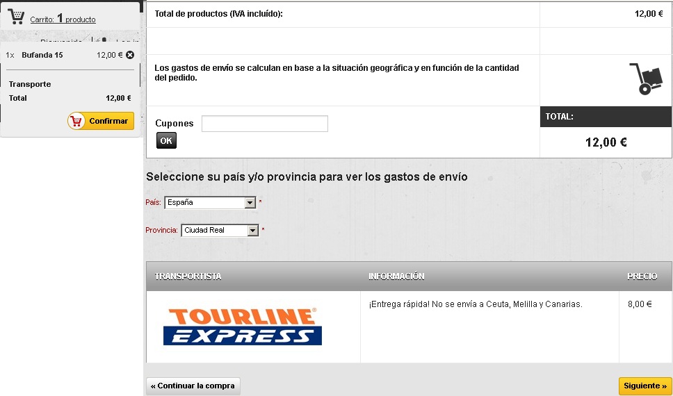 luis1414 Posted May 24, 2013 Share Posted May 24, 2013 Hola a todos, estoy probando el módulo estimación de la entrega para realizar un pedido sin estar logado o registrado pero no me funciona, no me ajusta el precio dependiendo de la provincia que seleccione, en otra tienda hecha con prestashop he visto algo que me ha gustado, que también sirve para calcular los gastos de envió sin necesidad de registro y que funciona bien, os adjunto una imagen para que lo veáis. Cuando añades un producto en el carrito solo te pone el precio del producto y debajo te dice que selecciones el país y la provincia y te dice los gastos de envío, si alguno sabe cómo se llama o como implantarlo se lo agradecería mucho, un saludo. Link to comment Share on other sites More sharing options...