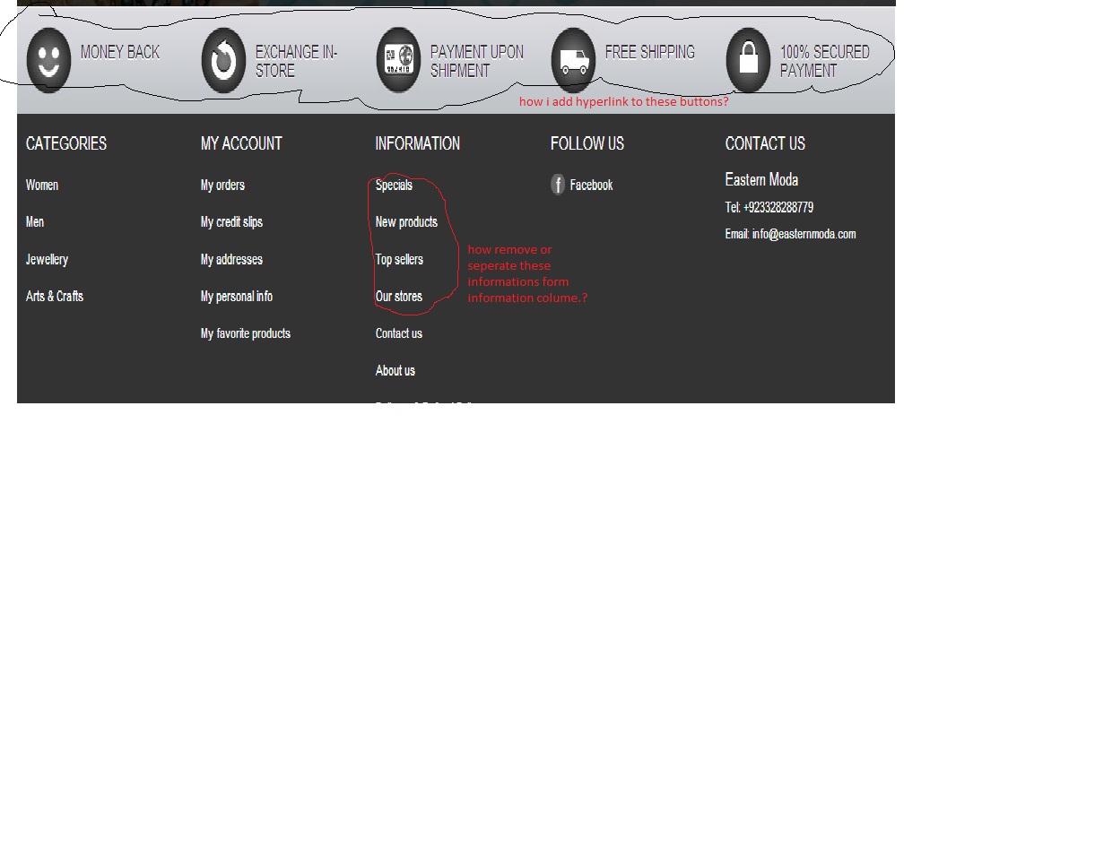 SmartDataSoft Posted May 27, 2013 Share Posted May 27, 2013 the first block is from /modules/blockreinsurance 1. if you want to disable that go to module and search blockreinsurance than disable that. 2. the other part is from this code which you can find \themes\default\modules\blockcms\blockcms.tpl (if you use default theme) <!-- MODULE Block footer --> <div class="block_various_links" id="block_various_links_footer"> <p class="title_block">{l s='Information' mod='blockcms'}</p> <ul> {if !$PS_CATALOG_MODE}<li class="first_item"><a href="{$link->getPageLink('prices-drop')}" title="{l s='Specials' mod='blockcms'}">{l s='Specials' mod='blockcms'}</a></li>{/if} <li class="{if $PS_CATALOG_MODE}first_{/if}item"><a href="{$link->getPageLink('new-products')}" title="{l s='New products' mod='blockcms'}">{l s='New products' mod='blockcms'}</a></li> {if !$PS_CATALOG_MODE}<li class="item"><a href="{$link->getPageLink('best-sales')}" title="{l s='Top sellers' mod='blockcms'}">{l s='Top sellers' mod='blockcms'}</a></li>{/if} {if $display_stores_footer}<li class="item"><a href="{$link->getPageLink('stores')}" title="{l s='Our stores' mod='blockcms'}">{l s='Our stores' mod='blockcms'}</a></li>{/if} <li class="item"><a href="{$link->getPageLink($contact_url, true)}" title="{l s='Contact us' mod='blockcms'}">{l s='Contact us' mod='blockcms'}</a></li> {foreach from=$cmslinks item=cmslink} {if $cmslink.meta_title != ''} <li class="item"><a href="{$cmslink.link|addslashes}" title="{$cmslink.meta_title|escape:'htmlall':'UTF-8'}">{$cmslink.meta_title|escape:'htmlall':'UTF-8'}</a></li> {/if} {/foreach} <li><a href="{$link->getPageLink('sitemap')}" title="{l s='sitemap' mod='blockcms'}">{l s='Sitemap' mod='blockcms'}</a></li> {if $display_poweredby}<li class="last_item">{l s='Powered by' mod='blockcms'} <a target="_blank" href="http://www.prestashop.com">PrestaShop</a>™</li>{/if} </ul> {$footer_text} </div> <!-- /MODULE Block footer --> and than remove those line and it will solve your issue. 2 Link to comment Share on other sites More sharing options...