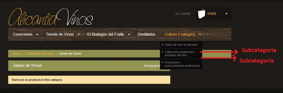 nadie Posted May 27, 2013 Share Posted May 27, 2013 Hola ! Ante todo agradecer la colaboración aquí prestada que me ha sacado de mas de un apuro con las configuraciones de prestashop. Ruego me ayudeis con un problema que me acaba de surgir, y es que quiero crear subcategorías dentro de paginas CMS para el menu horizontal pero creo que no se puede, al igual que puedo crear tantas subcategorias como quiera para productos, no logro conseguirlo con las paginas CMS. No se si me he explicado bien, mi idea es crear en la barra de menus una categoria CMS llamada CULTURA ENOLOGICA y que de hay baje / catas para empresas y amantes del vino y a su vez de esta que se divida en dos categorias más. dejo el enlace a mi página para que se pueda ver y a ver si tiene solución, www.alicantiavinos.es Muchas gracias por vuestra colaboración y ayuda!! Revisa esta guía: http://victor-rodenas.com/2013/01/13/guia-anadir-menus-de-contenidos-al-menu-horizontal-en-prestashop-1-5/ Link to comment Share on other sites More sharing options...