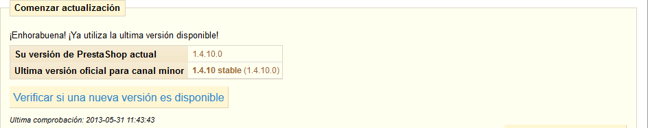 nadie Posted May 31, 2013 Share Posted May 31, 2013 Según Prestashop, la última versión estable, y con estable entiendo que no es Beta, es la 1.5.4.1 No sería esta versión a la que debería actualizar 1 Click? Como ves, estoy un poco pez en todo esto... Gracias! ¿Desde que version estas actualizando? La ultima estable es la 1.5.4.1 Es posible que si usas la 1.4.8, el te recomiende por defecto primero actualizar a la 1.4.10 y despues ya de la 1.4.10 te recomendara actualizar a la 1.5.4.1 Link to comment Share on other sites More sharing options...