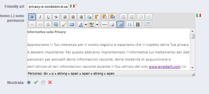 dvanet Posted June 1, 2013 Author Share Posted June 1, 2013 (edited) Ciao, l'editor di questo forum per esempio mette a disposizione il font, il corpo del testo eccc, mentre quello di prestashop è un po' povero. guarda l'immagine in allegato. così è come appare a me. solo che per modificare tutto devo preparare l'html... non c'è un editor migliore per ps? grazie daniele Aggiungo un chiarimento: l'editor della pagina "informazioni" dei prodotti è perfetto. Quello della pagina CMS invece è un po' povero. non si riesce a fare in modo che tutte le pagine usino gli stessi editor? Edited June 2, 2013 by dvanet (see edit history) Link to comment Share on other sites More sharing options...