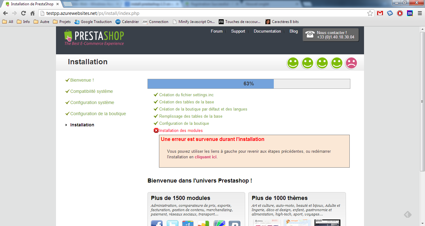 Dacer08 Posted June 2, 2013 Share Posted June 2, 2013 Bonjour, En essayant d'installer Prestashop 1.5.* sur Windows Azure j'ai toujours la même erreur à l'installation des modules (screenshot en pièce jointe). Par contre, prestashop 1.4.8.2 marche sans problème. Pouvez vous me dire quelles sont mes possibilités svp pour avoir prestashop à jour ? Merci d'avance. Dacer. Link to comment Share on other sites More sharing options...