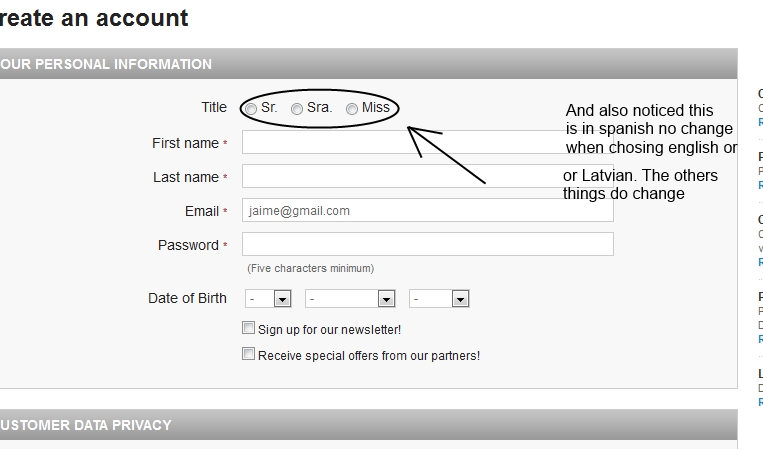 vekia Posted June 5, 2013 Share Posted June 5, 2013 you can change customer "titles" in the back office. just open the: Customer > Titles tab and edit values for available titles try this, maybe there you haven't got translations 1 Link to comment Share on other sites More sharing options...