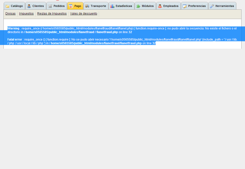 balance Posted June 4, 2013 Share Posted June 4, 2013 (edited) He actualizado a traves del modulo 1ClickUpdate y tengo errores referentes al módulo fianetfraud. He activado el registro de errores y me da como resultado lo siguiente: Warning: require_once(/home/s0565585/public_html/modules/fianetfraud/fianet/fianet.php) [function.require-once]: failed to open stream: No such file or directory in/home/s0565585/public_html/modules/fianetfraud/fianetfraud.php on line 32 Fatal error: require_once() [function.require]: Failed opening required '/home/s0565585/public_html/modules/fianetfraud/fianet/fianet.php' (include_path='.:/usr/lib/php:/usr/local/lib/php') in /home/s0565585/public_html/modules/fianetfraud/fianetfraud.php on line 32 Adjunto imagen. El mismo error me da en la pestaña de Módulos y en la pestaña de Pago Alguna solución? Gracias Edited June 4, 2013 by balance (see edit history) Link to comment Share on other sites More sharing options...