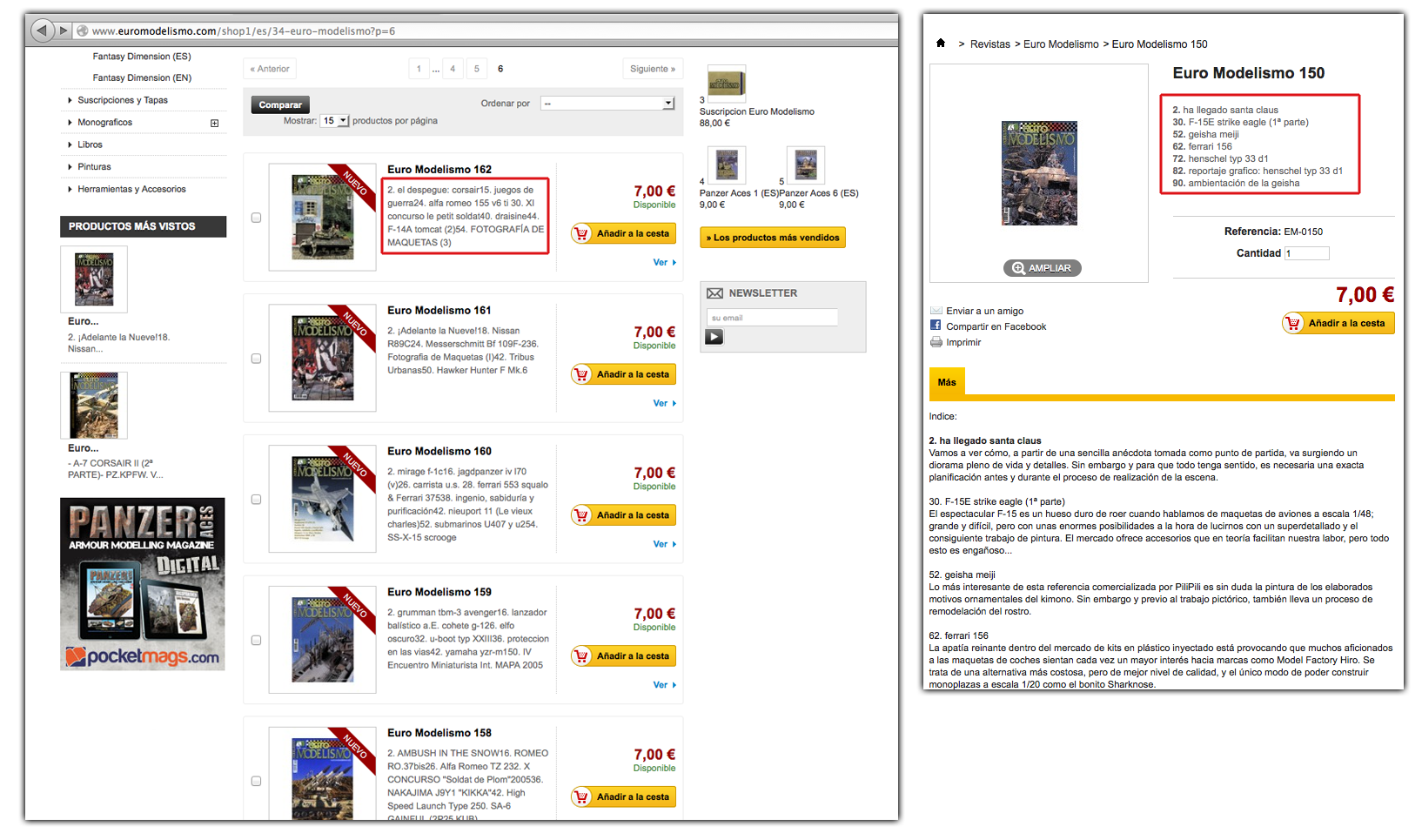 nadie Posted June 4, 2013 Share Posted June 4, 2013 Hola, he estado buscando por el foro y por lo que he encontrado se supone que debo hacer lo siguiente: Editar fichero product.tpl Busca esta linea: <div id="short_description_content" class="rte align_justify">{$product->description_short|strip_tags}</div> Y dejala así: <div id="short_description_content" class="rte align_justify">{$product->description_short}</div> No se te olvide ir luego a la pestaña Preferencias/Rendimiento de tu tienda y forzar compilación, para poder aplicar los cambios. Cuando he buscado dentro de themes/default/product.tpl lo encuentro como se supone que hay que dejarla: {if $product->description_short} <div id="short_description_content" class="rte align_justify">$product->description_short}</div> {/if} La descripción Breve la veo bien en la ficha de producto pero no en el listado de productos cuando entro en la categoría correspondiente (adjunto captura de pantalla para aclar lo que intento explicar) ¿Que puedo hacer para visualizar la breve descripción igual que en la ficha del producto? Muchas Gracias, David. Para el listado de productos, es el fichero: /themes/tu-plantilla/product-list.tpl Link to comment Share on other sites More sharing options...