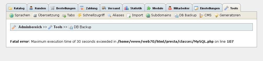 Fehlermeldung bei DB Backup über Frontend PS 1.3.1.1