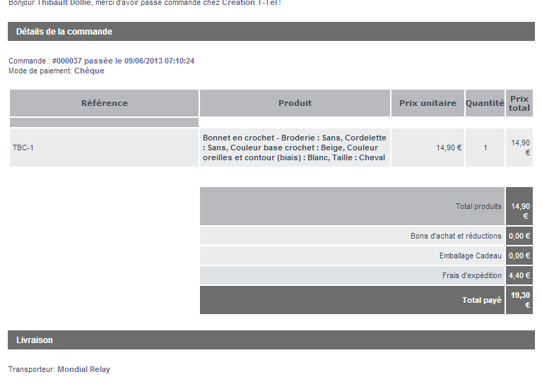 Tibo Tel Posted June 9, 2013 Share Posted June 9, 2013 (edited) Bonjour, Je suis en train de configurer le mail confirmation de commande dans outils/traductions/email (langue française). Lorsque j'ouvre le fichier conf_order.html directement dans Mozilla ou Chrome la mise en forme est comme je le souhaite (fichier ci-joint). Par contre lorsque mon serveur envoi le mail c'est très différent pour ne pas pas dire bordélique (je le dis quand même). Cf image ci-jointe. Est-ce que quelqu'un à une idée sur la cause du problème ? Merci d'avance et bon dimanche. order_conf.html Edited June 9, 2013 by Creation_T-tel (see edit history) Link to comment Share on other sites More sharing options...
