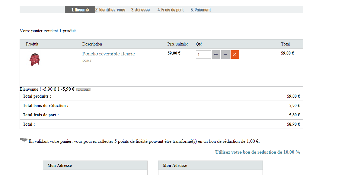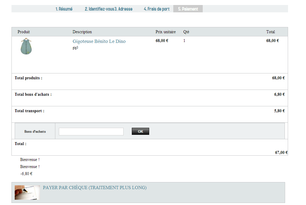 FLAVINOU Posted June 10, 2013 Share Posted June 10, 2013 (edited) Bonjour, je suis sous prestashop 1.5.3, thèmes blackhawk 1.2, Mon site : http://www.flexy-s.com Dans le panier il y a un problème d'affichage pour la partie bon de réduction et je n'arrive pas a modifier, es ce que vous avez une solution. Et j'ai un autre problème, quand je valide le bon de réduction dans Paiement, il me ramène sur la page résumé, avec la réduction faite, pourquoi il ne reste pas sur la page paiement? Merci Edited June 17, 2013 by FLAVINOU (see edit history) Link to comment Share on other sites More sharing options...