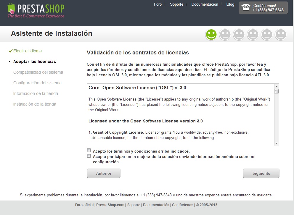 eltano3d Posted June 10, 2013 Share Posted June 10, 2013 Hola buenas tardes a todos. Estoy instalando PrestaShop v1.5.4 que baje del sitio oficial. Inicio la instalación, “elijo el idioma” pasa bien, y vamos al segundo paso donde debo “Aceptar la licencia” acepto, ambas… doy Siguiente. Y Me vuelve al segundo paso, donde debo aceptar la licencia. Adjunto imagen del error, y sepan en que pantalla estoy. Ver imágen Datos de interés: Prestador, Dattatec Servidor Linux Base de dato a la versión 5.4.13. Hasta el momento como solución intente lo siguiente: Borrar el cache del navegador. Borrar toda la raíz del servidor que me brinda el hosting. ¿Qué puede ser que este ocasionando este inconveniente al querer instalarlo en el servidor? PD: Estuve buscando por el foro y creo que a nadie le ha pasado o no lo he visto. Link to comment Share on other sites More sharing options...