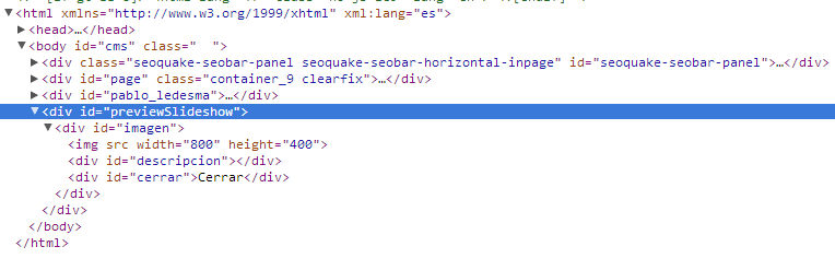 pabloledesma Posted June 14, 2013 Author Share Posted June 14, 2013 (edited) Hola statictic Estoy usando este script: $(document).on("ready", main); function main() { $("body").append("<div id='previewSlideshow'><div id='imagen'><img src='' width='800' height='400' /><div id='descripcion'></div><div id='cerrar'>Cerrar</div></div></div>"); $("#slide1 .imagen").on("click", abrirImagen); $("#previewSlideshow #cerrar").on("click", cerrarImagen); } function abrirImagen() { //code $("#previewSlideshow").fadeIn(); $("#previewSlideshow img").attr('src', '/themes/LDW/img/slideShow' + ($(this).index()+1) + '.jpg'); $("#previewSlideshow #descripcion").text($(this).attr('title')); } function cerrarImagen() { //code $("#previewSlideshow").fadeOut(); $("#previewSlideshow").remove(); } pero funciona a medias porque si construye los divs que le he ordenado pero no modifica el atributo src de la etiqueta img (ver imagen adjunta). Porfavor regalame uno de tus excelentes concejos Edited June 14, 2013 by pabloledesma (see edit history) Link to comment Share on other sites More sharing options...